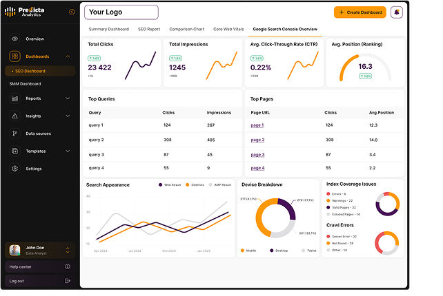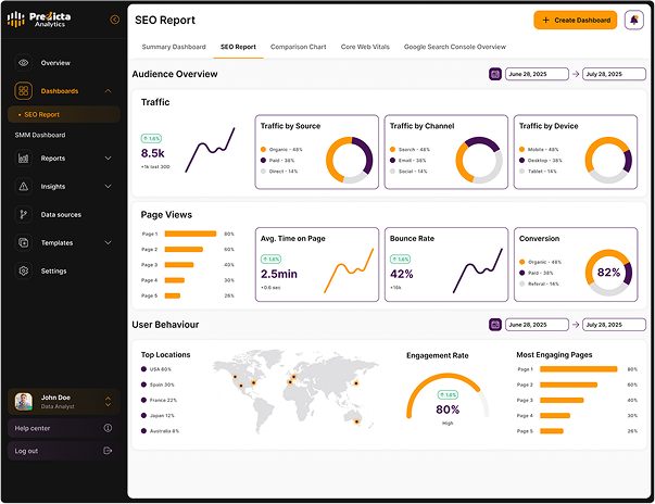 Let’s face it that most clients don’t read reports unless they’re simple, visual, and speak their language. At Predicta Analytics we makes it easy to deliver reporting that not only looks stunning but actually makes sense. Whether you are an SEO consultant, freelancer or an agency managing dozens of clients, our white-label features make you look like the hero behind the data.